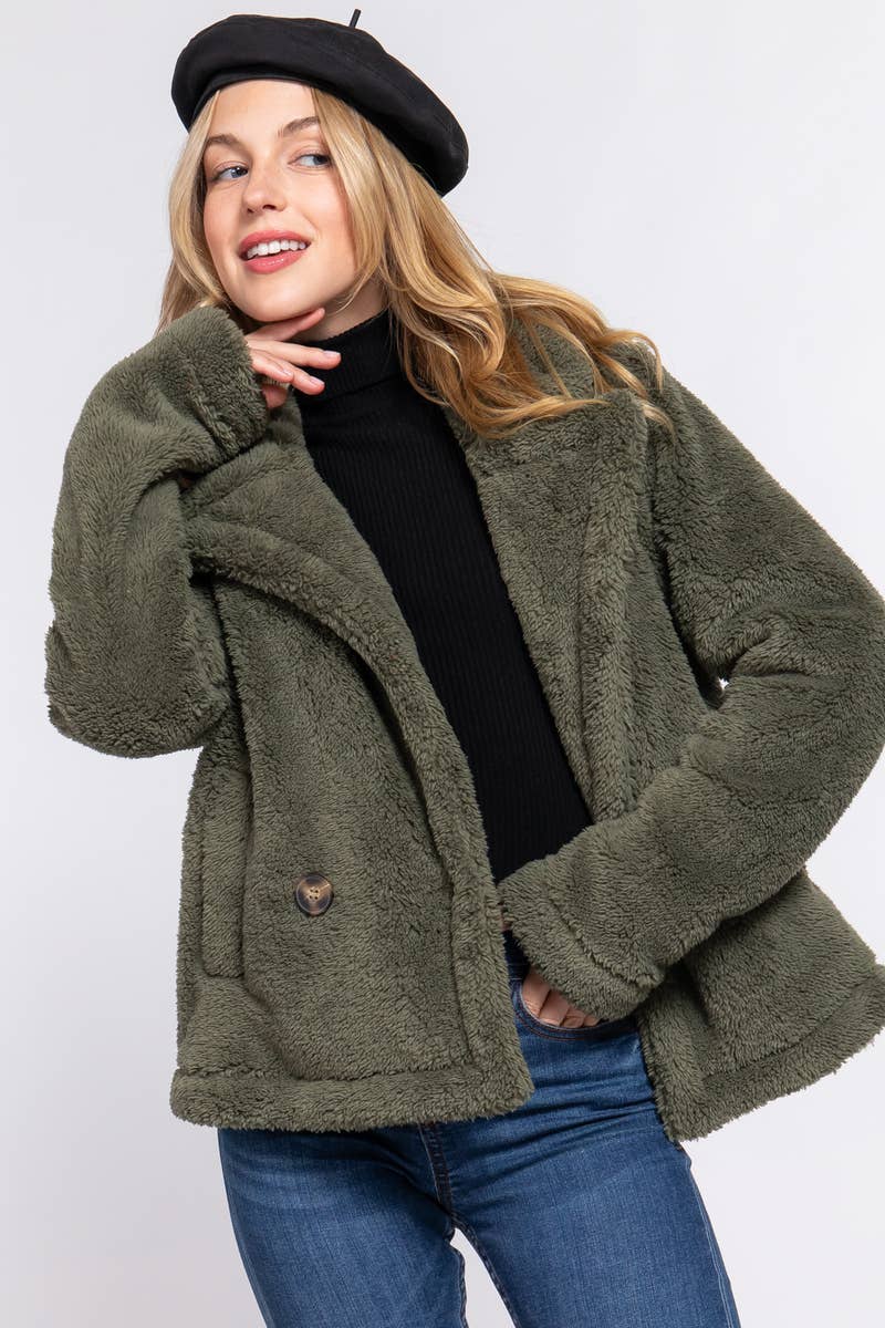 NOTCHED COLLAR PATCH POCKET SHERPA COAT Fabric Content: FABRUC: FAUX FUR 100% POLYESTER